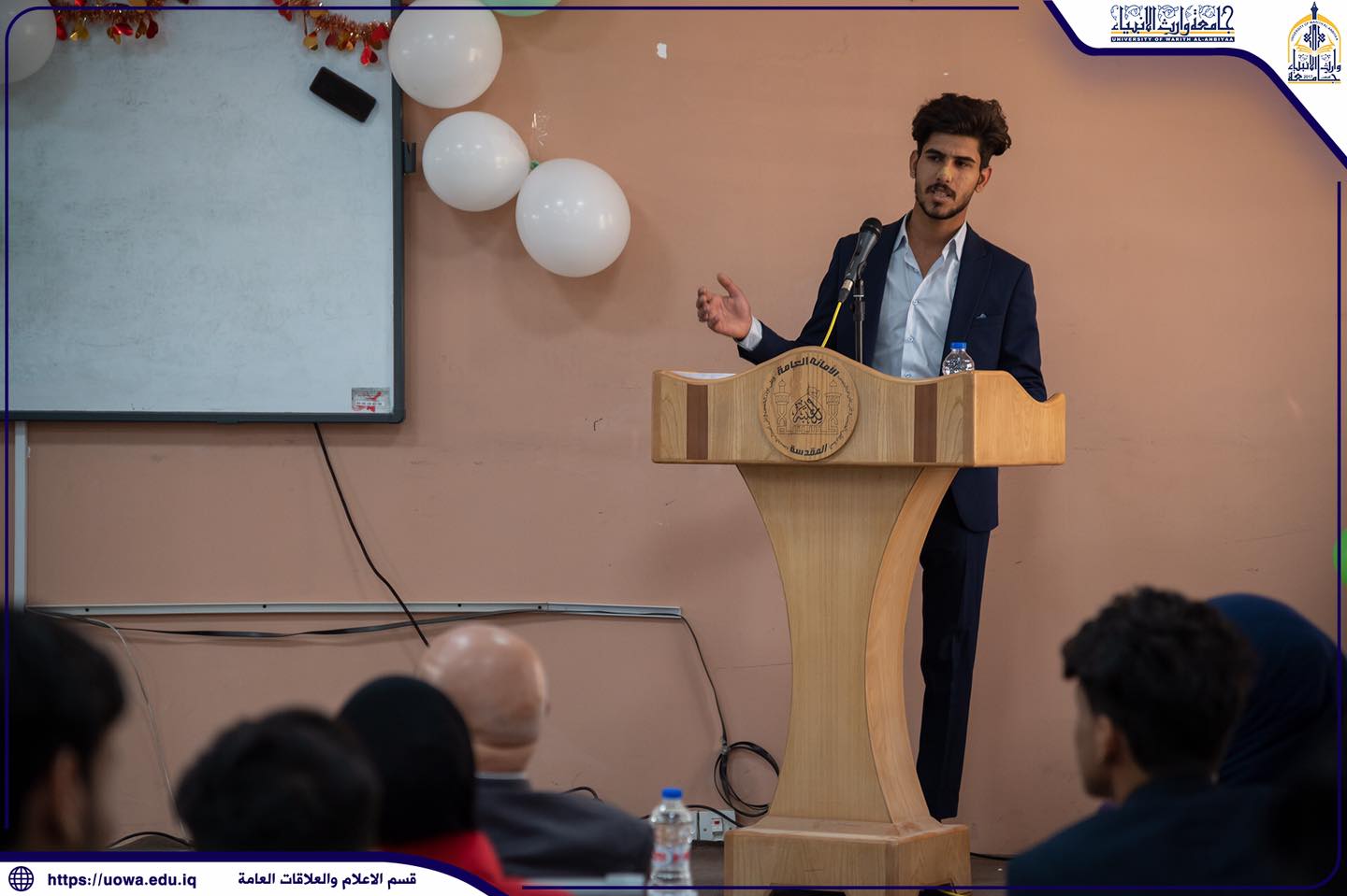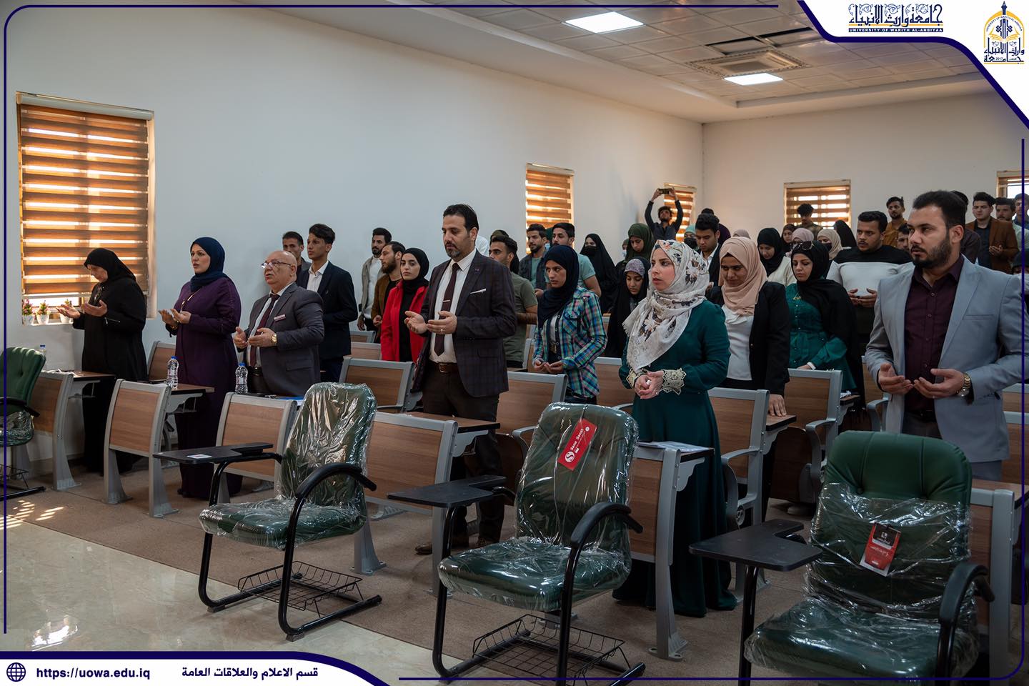 جانب من احتفالية كلية الادارة والاقتصاد في جامعة وارث الانبياء(عليه السلام) بذكرى ولادة الامام المهدي(عج)، تخللها مشاركات شعرية وقصائد بحب آل البيت القاها طلبة الكلية فضلاً عن محاضرة توعوية قدمها الشيخ الدكتور ستار عويد من كلية العلوم الاسلامية في الجامعة.