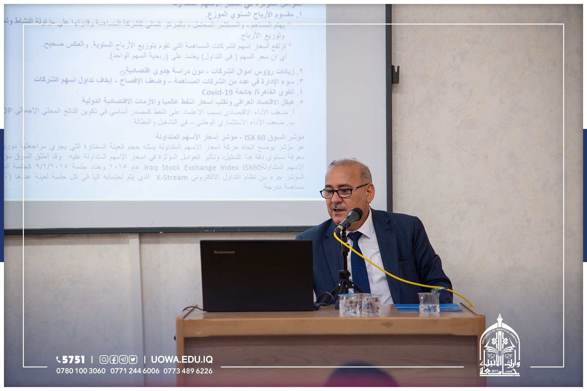 اقامت كلية الادارة والاقتصاد/قسم المحاسبة ندوة علمية بعنوان"سوق العراق للاوراق المالية" قدمها الخبير طه احمد عبد السلام المدير التنفيذي لسوق العراق للأوراق المالية.