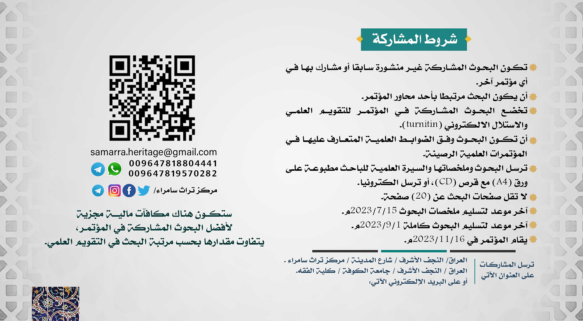 تحت شعار (العتبة العسكرية المقدسة في سامراء حاضرة الفكر والتراث) وبرعاية العتبة العسكرية المقدسة، يقيم مركز تراث سامراء (المؤتمر العلمي الدولي الثالث)
