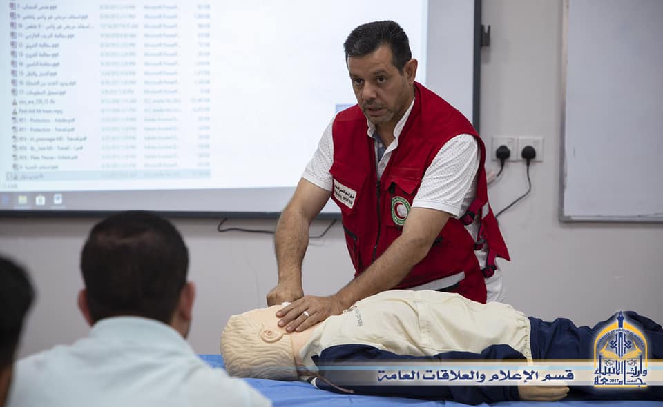 نظم مركز التعليم المستمر في جامعة وارث الانبياء(عليه السلام) وبالتنسيق مع جمعية الهلال الأحمر العراقي فرع كربلاء المقدسة ورشة عمل تدريبية لمنتسبي الجامعة والطلبة في الأسعافات الأولية ، وتضمنت الورشة تدريب المشاركين على كيفية اسعاف المرضى والجرحى في الحالات الطارئة والحوادث وماهي الحالات البديلة قبل نقل المريض الى المستشفى في الدقائق الأولى من الأصابة والتي شملت كافة الخطوات الواجب القيام بها للتعامل مع هذه الحالات بالشكل المبسط وبتطبيق عملي لتسهيل التعلم والتصرف بحكمة لتفادي هذه المشاكل مثل حالات (الاختناق , الغرق , الحريق , والانفجارات) والحالات الاضطرارية كحالات فقدان الوعي ، والتعامل مع كل حالة بشكل يختلف عن الاخر فضلا عن التدريب على مبادئ الاسعافات الاولية في الحالات الطارئة نتيجة الاحداث التي يتعرض لها البلد وما يتعرض له المواطن في حياته اليومية ، فيما اكد السيد سامر نزار عبد مدرب اسعافات اولية في جمعية الهلال انه من الضروري تدريب الجميع على الاسعافات الاولية لأنها تعد الطريقة المثلى لانقاذ حياة المواطنين في الدقائق الاولى لوقوع الحادث والتي تعد الدقائق الذهبية لأنقاذ حياة المصاب.