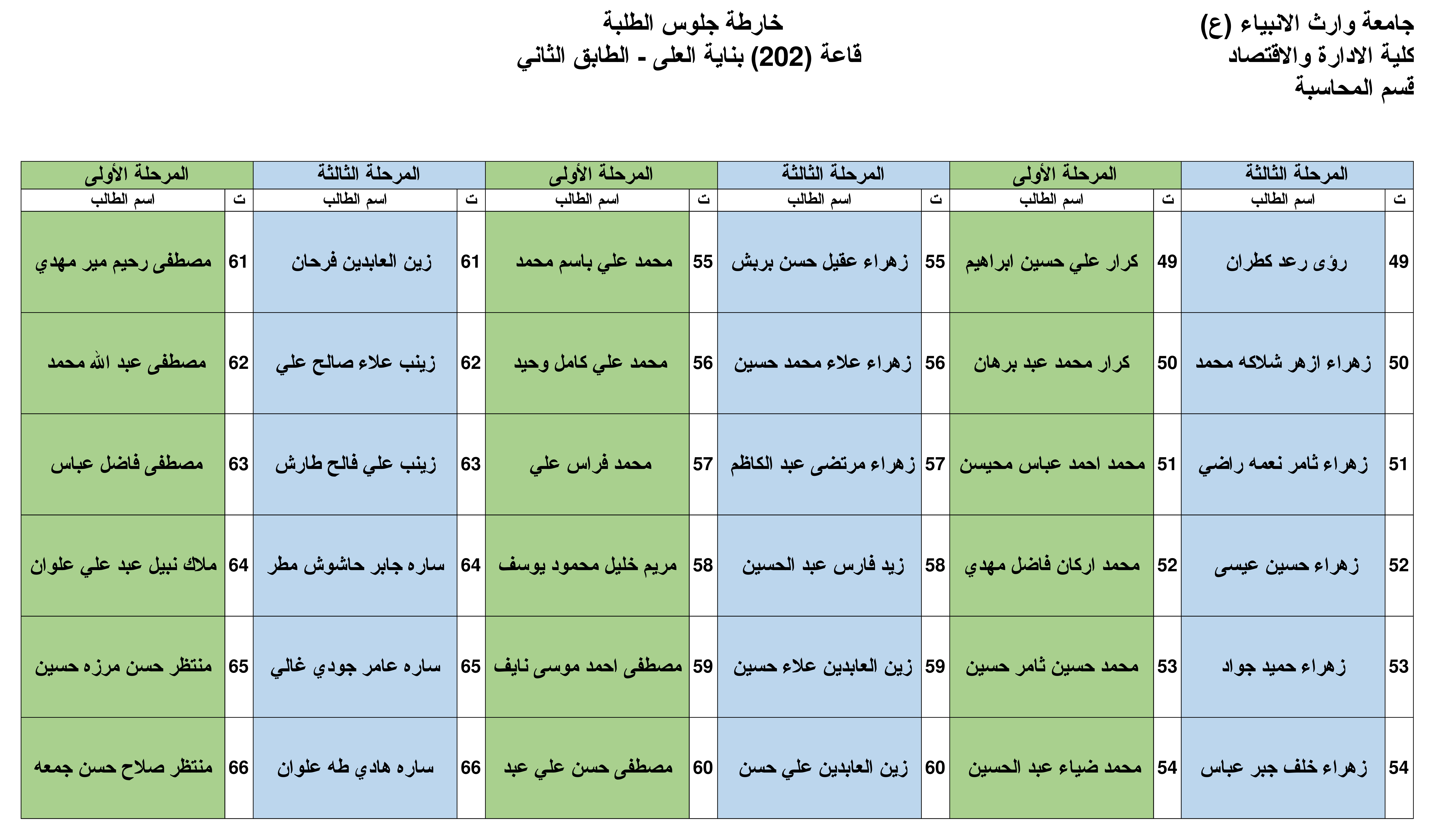 نرفق لكم خارطة الجلوس في القاعات الامتحانية لقسم المحاسبة للمرحلة الأولى والثالثة وكما موضحة في أدناه