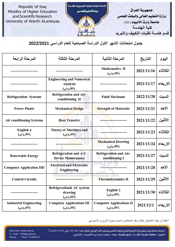 جدول الامتحانات الشهرية لقسم هندسة تقنيات التكييف والتبريد للدراستين الصباحية والمسائية