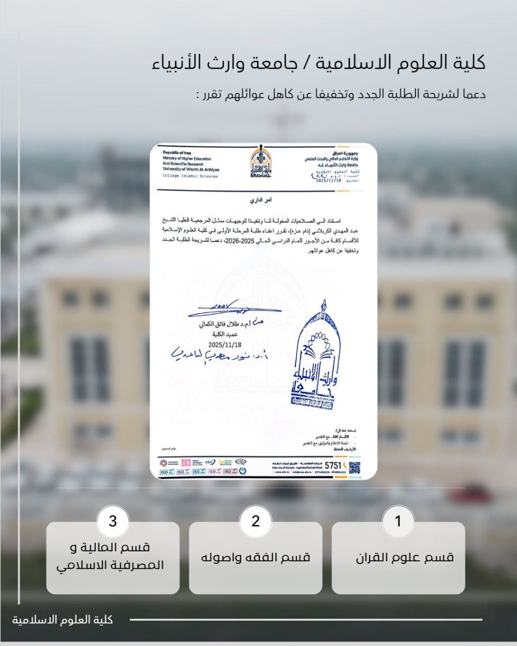 اعفاء اجور المرحلة الاولى لطلبة كلية العلوم الاسلامية للعام الدراسي الحالي 2025-2026 للاقسام كافة