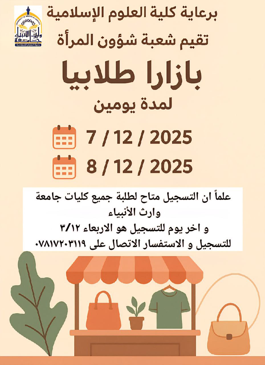 برعاية كلية العلوم الإسلامية، تقيم شعبة شؤون المرأة بازارًا طلابيًا داخل الحرم الجامعي لمدة يومين، وذلك في: