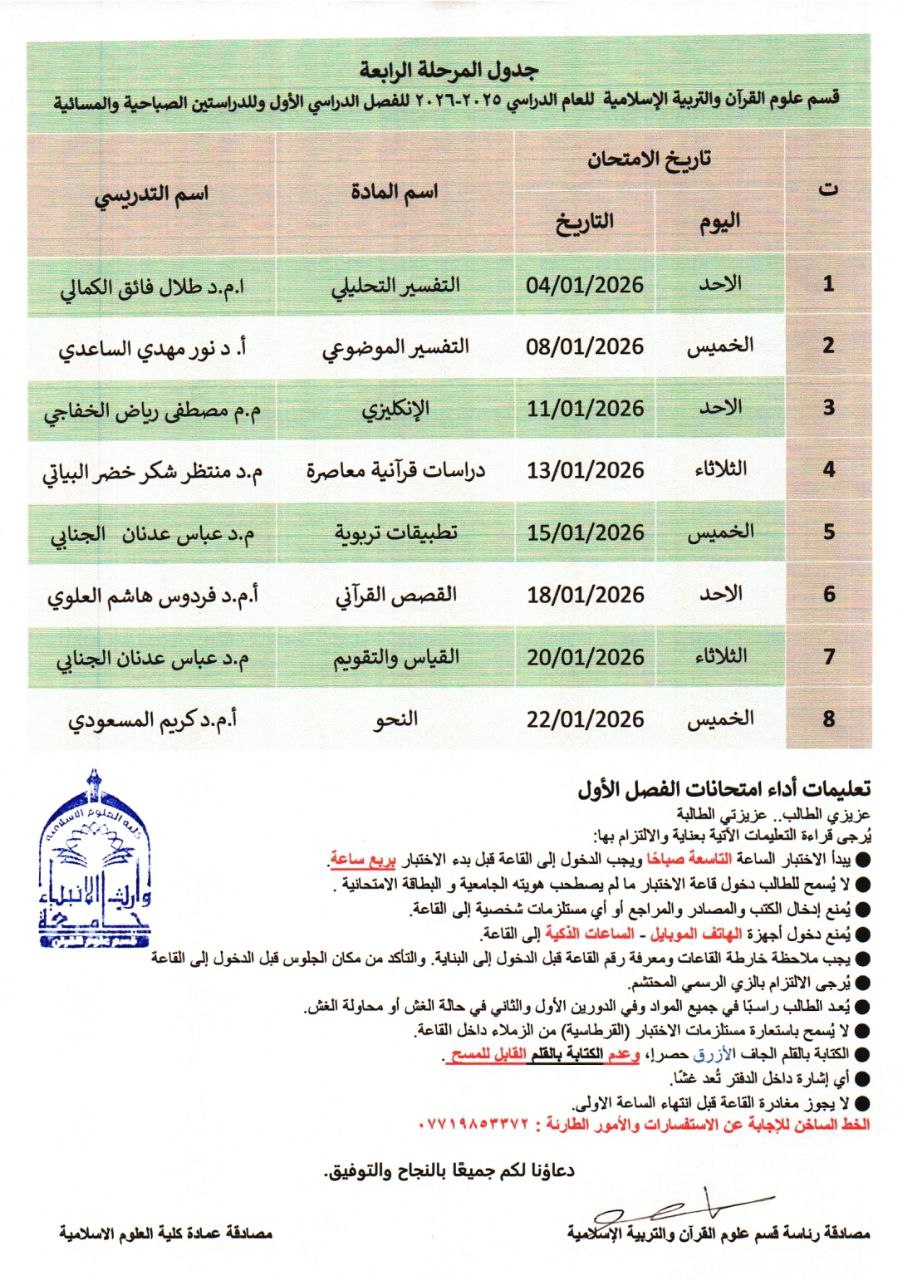 الجدول النهائي للفصل الدراسي الاول لقسم علوم القرآن والتربية الاسلامية للدراستين الصباحية والمسائية للعام الدراسي 2025-2026
