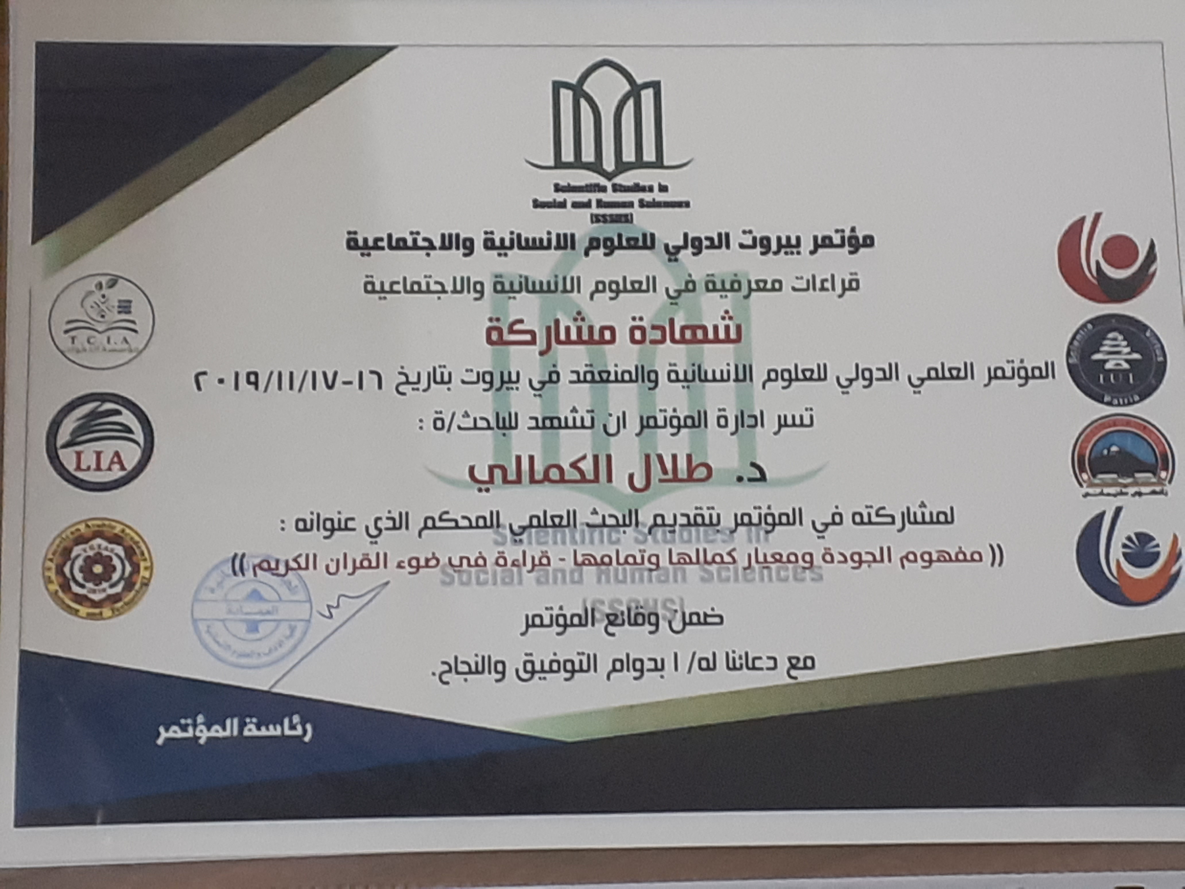 شارك الدكتور طلال فائق الكمالي عميد كلية العلوم الاسلامية / جامعة وارث الانبياء في مؤتمر بيروت الدولي للعلوم الانسانية والاجتماعية المنعقد بتاريخ 16-17 /11/2019 بتقديم بحثه الموسوم بـ ( مفهوم الجودة ومعيار كمالها وتمامها - في ضوء القرآن الكريم ) راجين المولى له دوام النجاح والموفقية