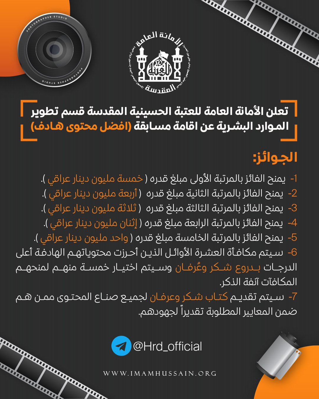تعلن الأمانة العامة للعتبة الحسينية المقدسة قسم تطوير الموارد البشرية عن إقامة مسابقة (افضل محتوى هادف) وتكون المسابقة وطنية عامة تشمل كافة الناس من صناع المحتوى والمهتمين والهواة للمشاركة في هذه المسابقة.