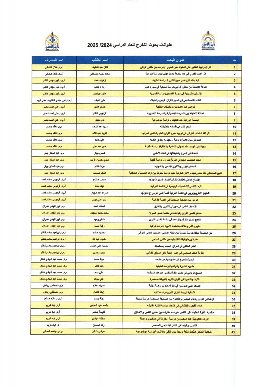 بحوث التخرج لطلبة كلية العلوم الاسلامية (قسم علوم القران - قسم الفقه واصوله) للعام الدراسي 2024 - 2025