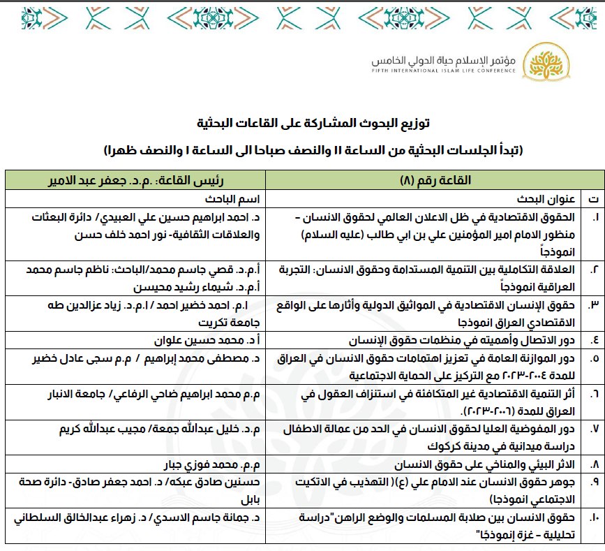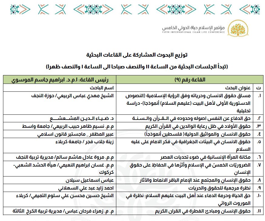 أقيم المؤتمر العلمي الخامس "الإسلام حياة" تحت شعار "حقوق الإنسان والتحديات المعاصرة" بمشاركة واسعة من جامعات العراق والدول العربية والأجنبية. وقالت الدكتورة نور مهدي الساعدي إن المؤتمر شهد تقديم 85 بحثًا من مختلف جامعات العراق، من السليمانية إلى البصرة، وهي سابقة تنفرد بها مؤتمرات كلية العلوم الإسلامية في جامعة وارث الأنبياء.