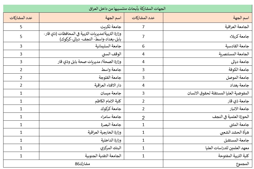 تضمن التقرير إشادة بالجهود التي بذلتها مختلف الجهات الأكاديمية والعلمية من داخل العراق وخارجه. شاركت في المؤتمر 21 بحثاً من 9 دول مختلفة، شملت مصر، سوريا، لبنان، تركيا، المغرب، تونس، ألمانيا، نيجيريا، والجزائر، إضافة إلى 85 بحثاً من جميع أنحاء العراق، من السليمانية إلى البصرة.