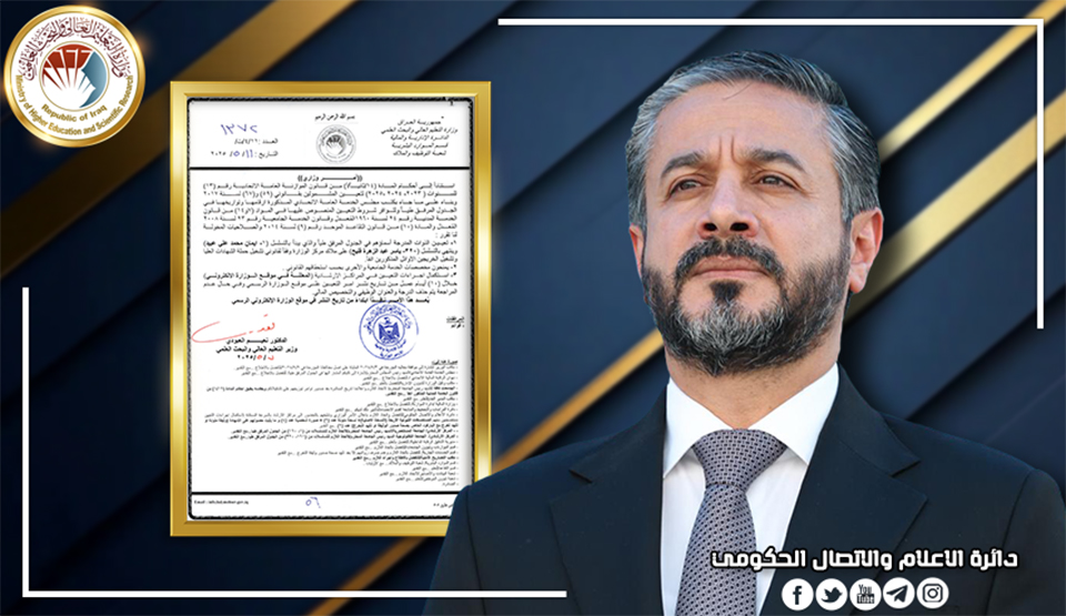 حرصا على مراعاة الظروف وتذليل التحديات أمام الطلبة في مسيرتهم الدراسية ونتائجها قرر وزير التعليم العالي والبحث العلمي الدكتور نعيم العبودي منح خمس درجات لمعالجة الحالات الحرجة للطلبة في جميع المراحل الدراسية للعام الدراسي 2025/2024.