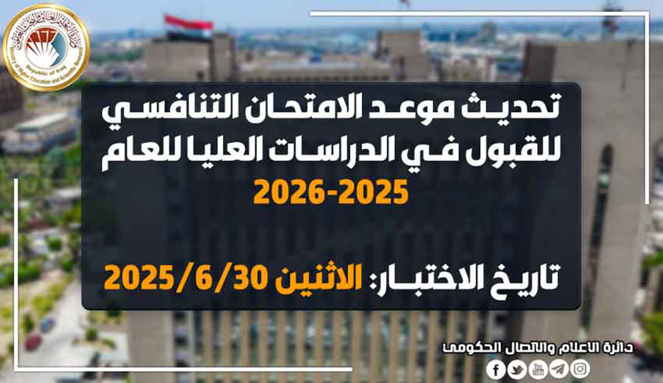 وتنوه وزارة التعليم العالي والبحث العلمي إلى أن الامتحان التنافسي سيكون في موعده المقرر يوم الاثنين الموافق 30 حزيران 2025.