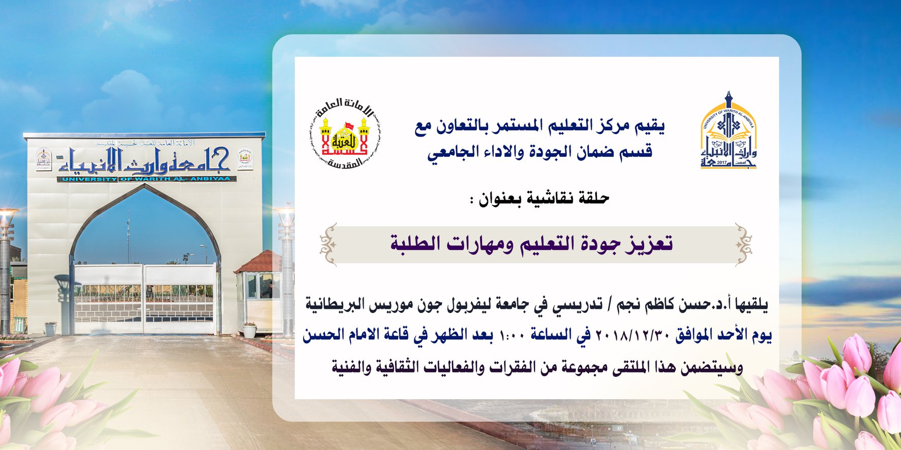 اقامت جامعة وارث الانبياء التابعة للعتبة الحسينية المقدسة /قسم ضمان الجودة والأداة الجامعي ندوة علمية حول اتفاقيات التوأمة مع الجامعات الاجنبية وذكر الدكتور نوفل الاعرجي المساعد الاداري لرئيس الجامعة أن الغرض من الندوة هو الاطلاع على المناهج المعمول بها في الجامعات الأجنبية بغية التطوير من مناهجنا والإتفاق مع جامعة ليفربول جون موريس بعد موافقة مجلس الجامعة وسيتم تقييم اداء الجامعة بالنسبة الى الجامعات البرطانية وعلى ضوئها سوف نتوصل لمعرفة النقاط التي يجب ان تتطور لكي نرتقي لمصاف الجامعات الكبرى, واضاف الاعرجي ان الاتفاقية تشمل تطوير طرائق التدريس ووسائل البحث العلمي وغيرها وأن استقدام الدكتور حسن النجم هو لغرض تمثيل جامعة ليفربول جون موريس وصياغة بنود الاتفاقية بالشكل الصحيح لانها تصب في مصلحة الخريجين حيث تسهم في تسهيل مهمة اداء دراستهم في الجامعات البرطانية وغيرها