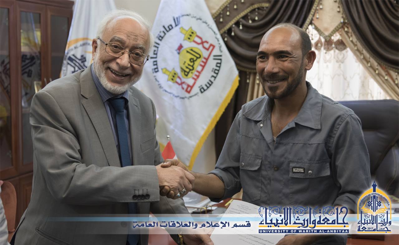 إيمانا منها بالنهج المحمدي العلوي ولما لاحظه رئيس الجامعة من خلال جولاته في الجامعة والإطلاع ميدانيا على كيفية أداء الواجب فإن ماشاهده على علي جاسم عبيد موظف خدمات من همة عالية في أدائه العمل فمرة يعمل في الزراعة وباتقان ومرة في النجارة وباتقان وأخرى بالخدمات الأخرى الصعبة ومن دون أن يعترض وكأنما يعمل لبيته أن مثل هذا العامل بالرغم من موقع عمله البسيط فأن رئاسة الجامعة تعتز به وقرر رئيس الجامعة اد طالب حسن موسى تكريمه في مكتبه وأمام رئيسه وزملائه متمنيا له الموفقية