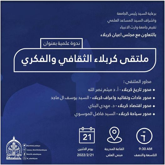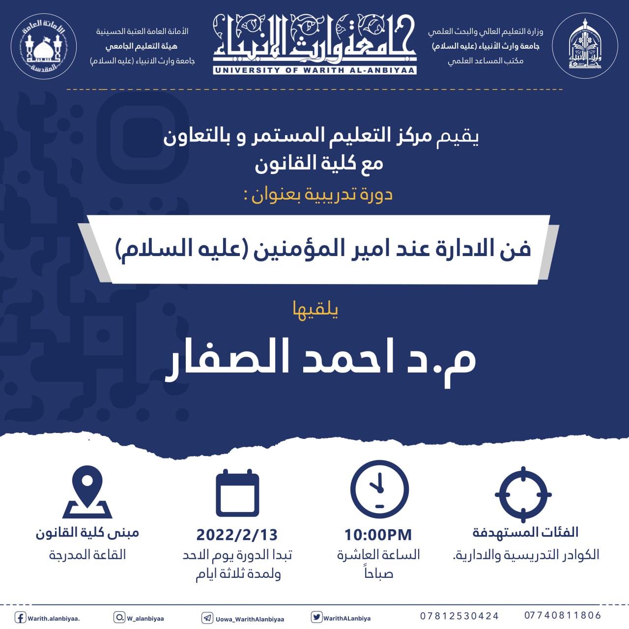 تزامنا مع ذكرى ولادة امير المؤمنين الامام علي (عليه السلام) نضم مركز التعليم المستمر في جامعة وارث الانبياء (عليه السلام) بالتعاون مع كلية القانون اليوم الاول من دورة "فن الادارة عند امير المؤمنين (عليه السلام)" والتي حاضر فيها من كلية القانون الدكتور احمد الصفار.علما ان الدورة تستمر ليومي الاثنين والثلاثاء الموافق 2022/2/15,14 على قاعة الامام الحسين (عليه السلام)/ كلية القانون في تمام الساعة العاشرة صباحا ولجميع الراغبين في الحضور.