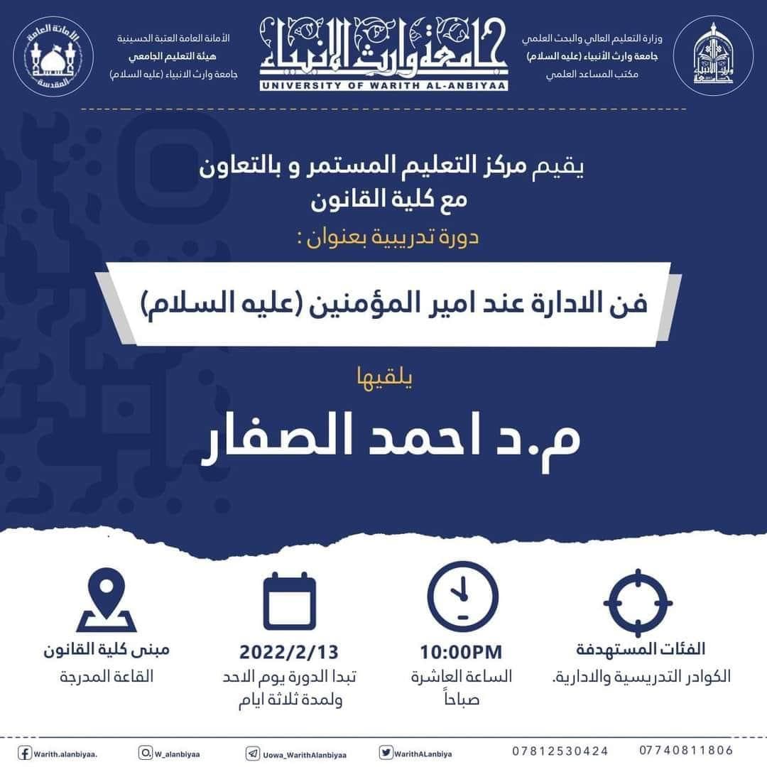 يقيم قسم التعليم المستمر في جامعة وارث الأنبياء (عليه السلام) وبالتعاون مع كلية القانون دورة تدريبية تحت عنوان "فن الإدارة عند أمير المؤمنين عليه السلام" يلقيها م.د أحمد الصفار على القاعة المدرجة في مبنى كلية القانون ابتداءً من يوم الاحد 13-2-2022 ولمدة ثلاثة أيام.