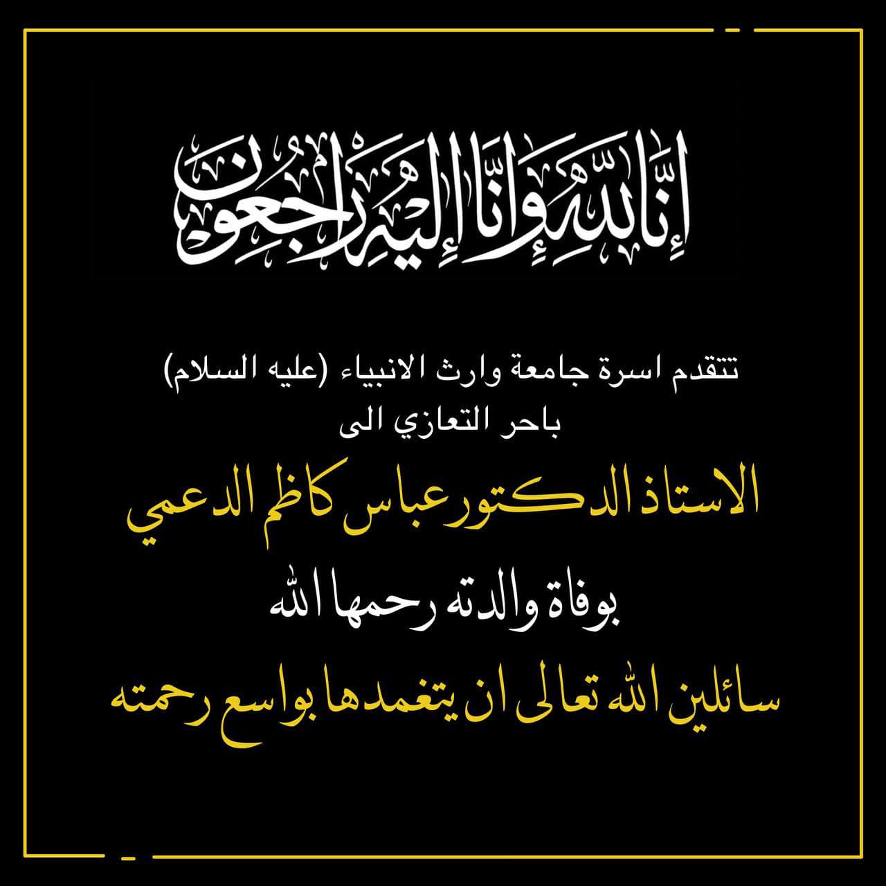 تتقدم أسرة جامعة وارث الأنبياء (عليه السلام) بأحر التعازي والمواساة الى جناب مساعد رئيس الجامعة للشؤون العلمية الاستاذ الدكتور عباس كاظم الدعمي لوفاة والدته سائلين العلي القدير أن يتغمدها بواسع رحمته ويلهم ذويها الصبر والسلوان
