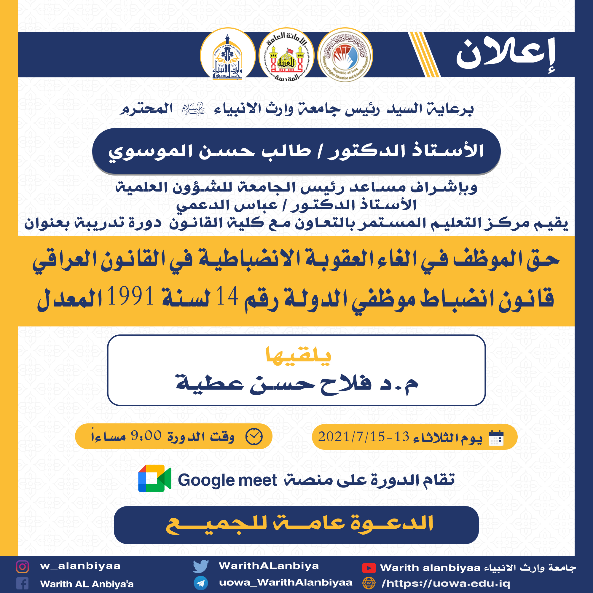 يقيم مركز التعليم المستمر بالتعاون مع مركز الحاسبة الالكترونية وقسم التسجيل والشؤون الطلابيه دورة بعنوان(الادارة الالكترونية الخاصة بطلبة جامعة وارث الانبياء (عليه السلام)) يحاضر في الدورة (م. د حيدر محمد علي الغانمي و م. م. صلاح مهدي الجبوري والسيد عباس العسكري) تستهدف رؤوساء الاقسام في الكليات و المقررين ومسؤولي الموقع الالكتروني للكليات (ممثل التعليم الالكتروني غير مشمول)وذلك من اجل التعرف على برنامج ادارة الطالب الالكترونية. علما ان الدورة تستمر لمدة ثلاث ايام ابتداءً من يوم السبت الموافق 2021/7/10 في تمام الساعة العاشرة صباحا في بناية العلى/ مختبر الحاسوب(3)، سيتم خلال الدورة الشرح والتنفيذ من اجل معرفة البرنامج وادارته بصورة تامة.