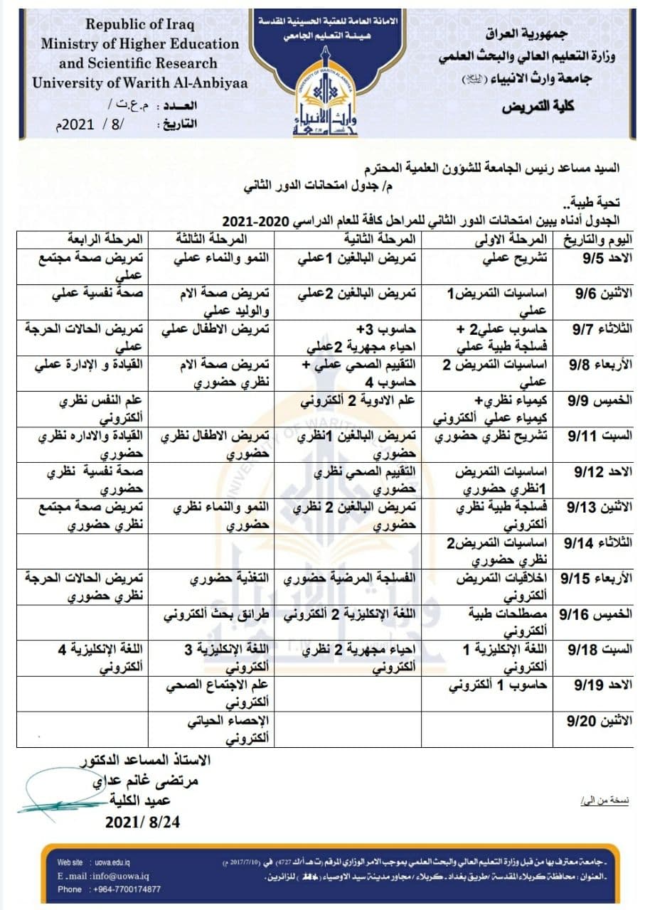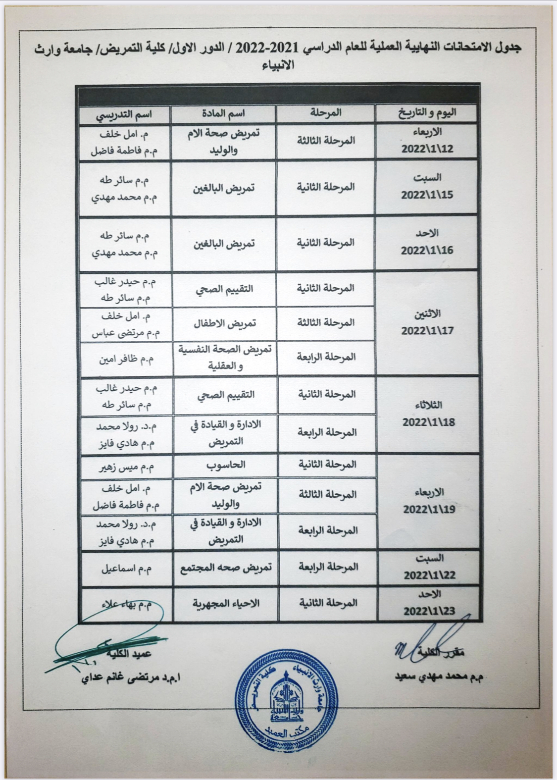 طلبتنا الاعزاء...  الجدول الامتحاني الخاص بالامتحانات النهائية في كلية التمريض للعام الدراسي 2021-2022