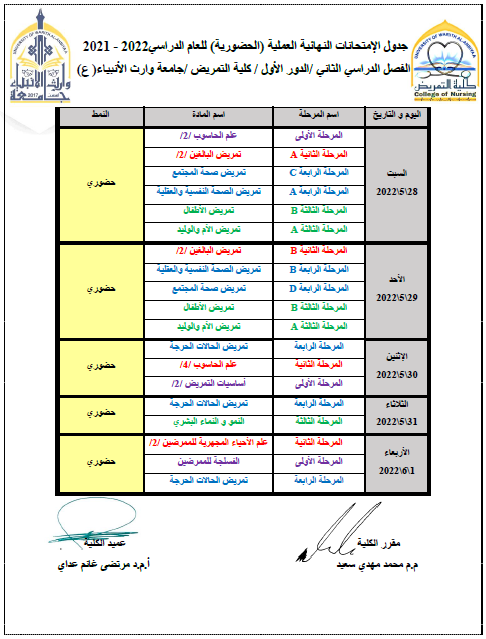 تمت مصادقة عمادة كلية التمريض على جدول الامتحانات العملية النهائية للمراحل ( الثانية و الثالثة و الرابعة ) للفصل الدراسي الثاني للعام الدراسي 2021/2022