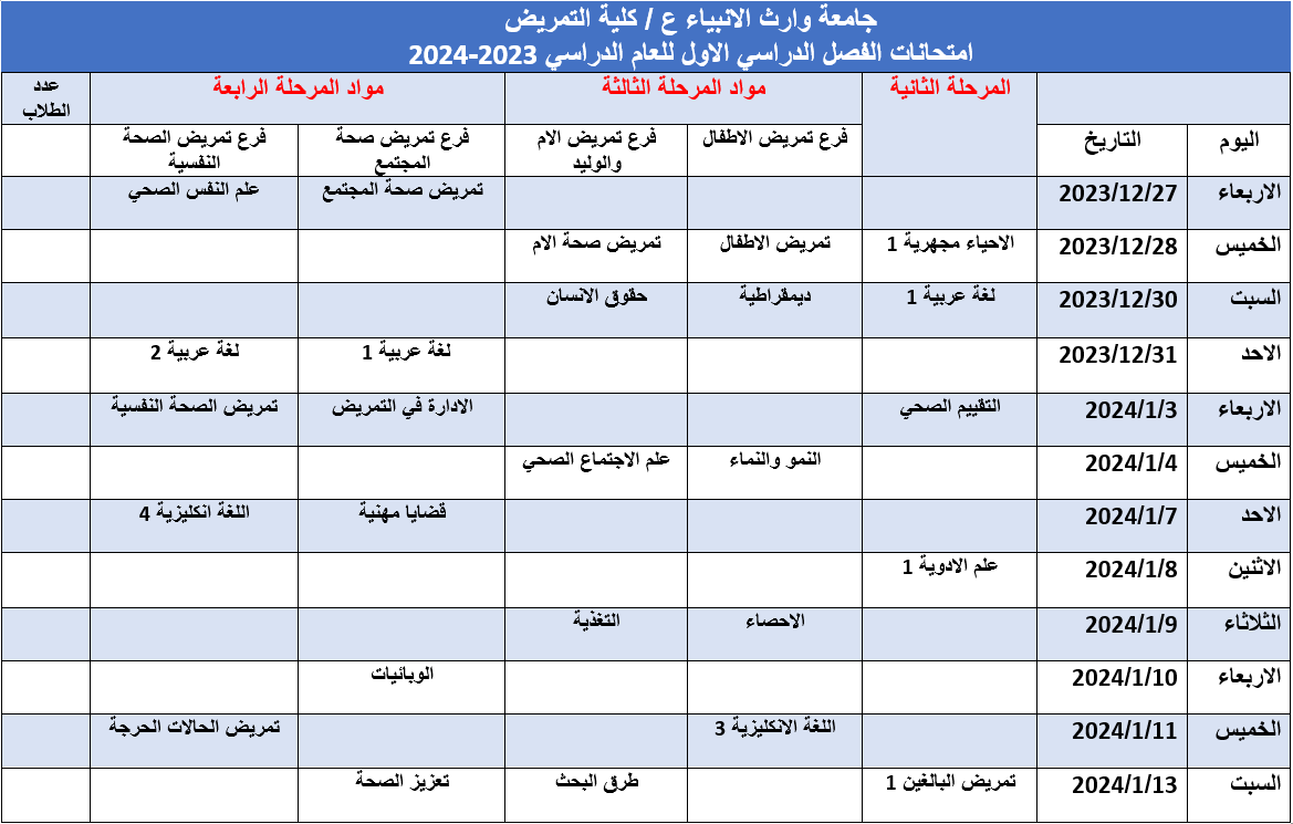 طلبتنا الاعزاء .. نرفق لكم جدول الامتحانات النهائية للفصل الاول من العام الدراسي 2023-2024 و للمراحل الثانية و الثالثة و الرابعة مع التعليمات الامتحانية  متمنين لكم دوام التوفيق و النجاح.