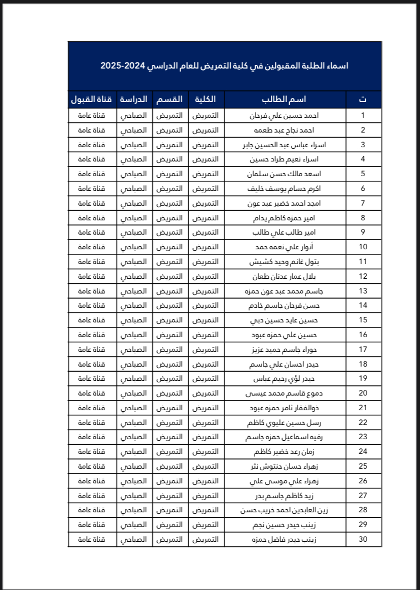 اسماء الطلبة المقبولين في كلية التمريض للعام الدراسي 2024_2025