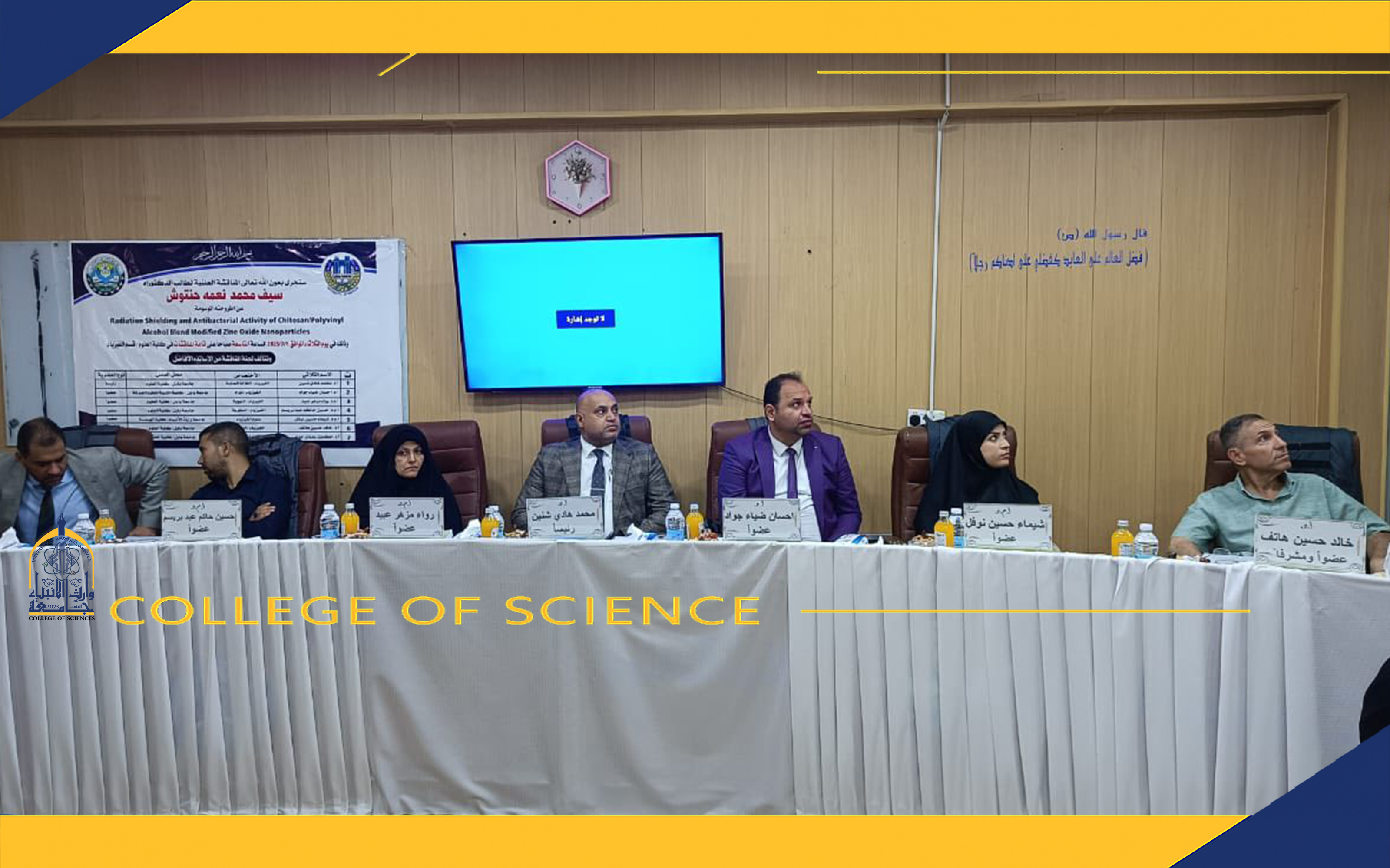 شاركت الأستاذ المساعد الدكتورة شيماء حسين نوفل، عميد كلية العلوم في جامعة وارث الأنبياء، ضمن لجنة مناقشة أطروحة دكتوراه في الفيزياء للطالب سيف محمد نعمه حنتوش، والتي أُجريت في كلية العلوم بجامعة بابل – قسم علوم الفيزياء.