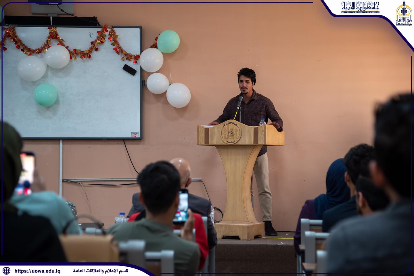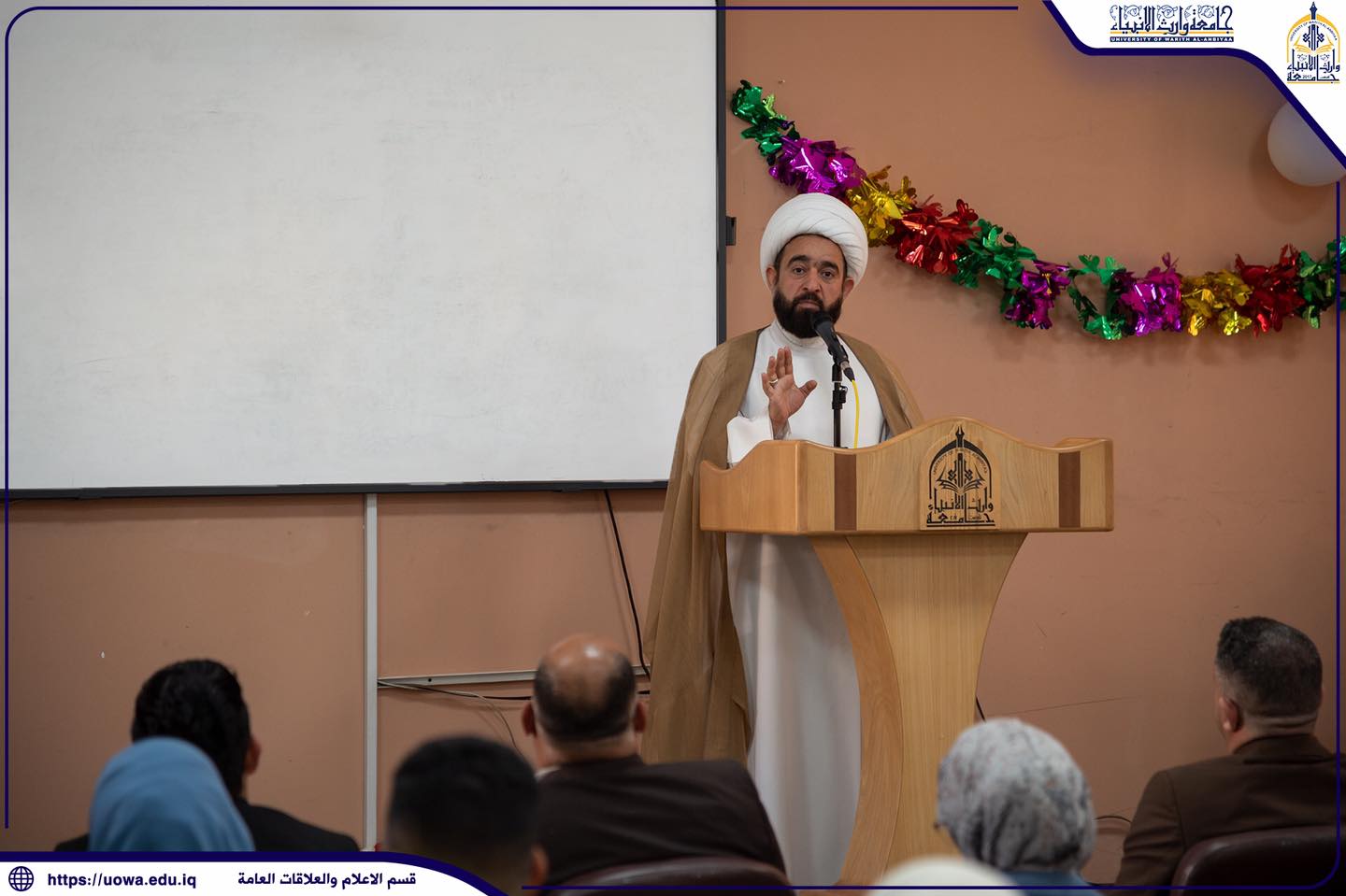 جانب من احتفالية كلية الادارة والاقتصاد في جامعة وارث الانبياء(عليه السلام) بذكرى ولادة الامام المهدي(عج)، تخللها مشاركات شعرية وقصائد بحب آل البيت القاها طلبة الكلية فضلاً عن محاضرة توعوية قدمها الشيخ الدكتور ستار عويد من كلية العلوم الاسلامية في الجامعة.