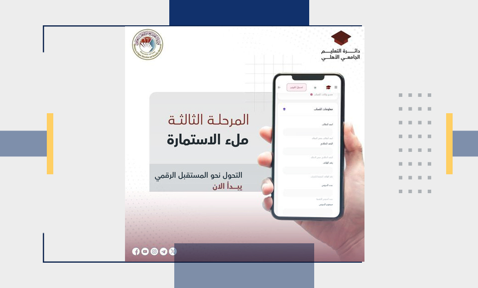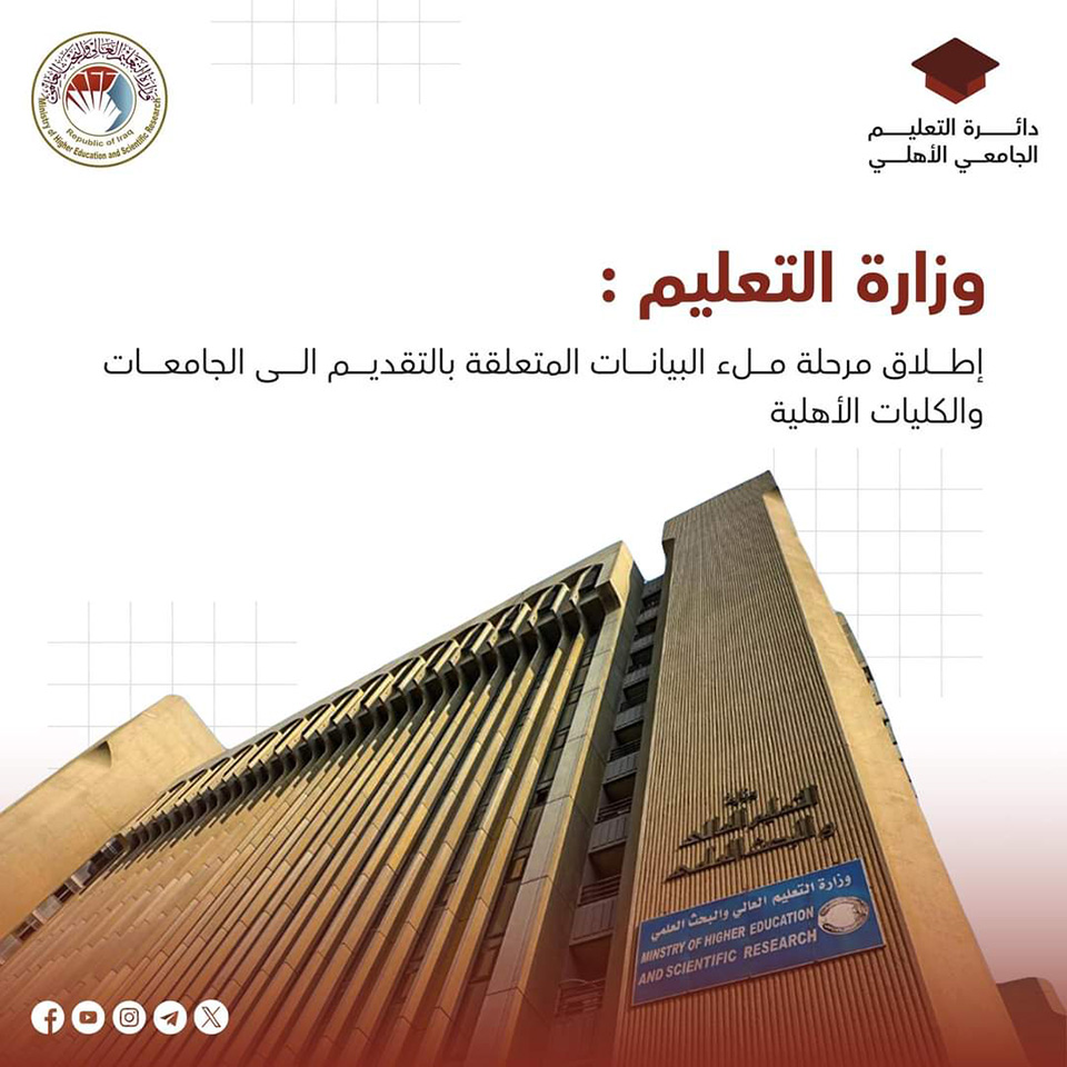 أعلنت وزارة التعليم العالي والبحث العلمي في العراق عن بدء مرحلة ملء البيانات وتفعيل القنوات الإلكترونية الخاصة بالتقديم إلى الجامعات الأهلية. يأتي هذا الإجراء كجزء من جهود الوزارة للتحول نحو مستقبل أكاديمي رقمي، يهدف إلى تسهيل عمليات التقديم وتوفير تجربة متطورة للطلاب.