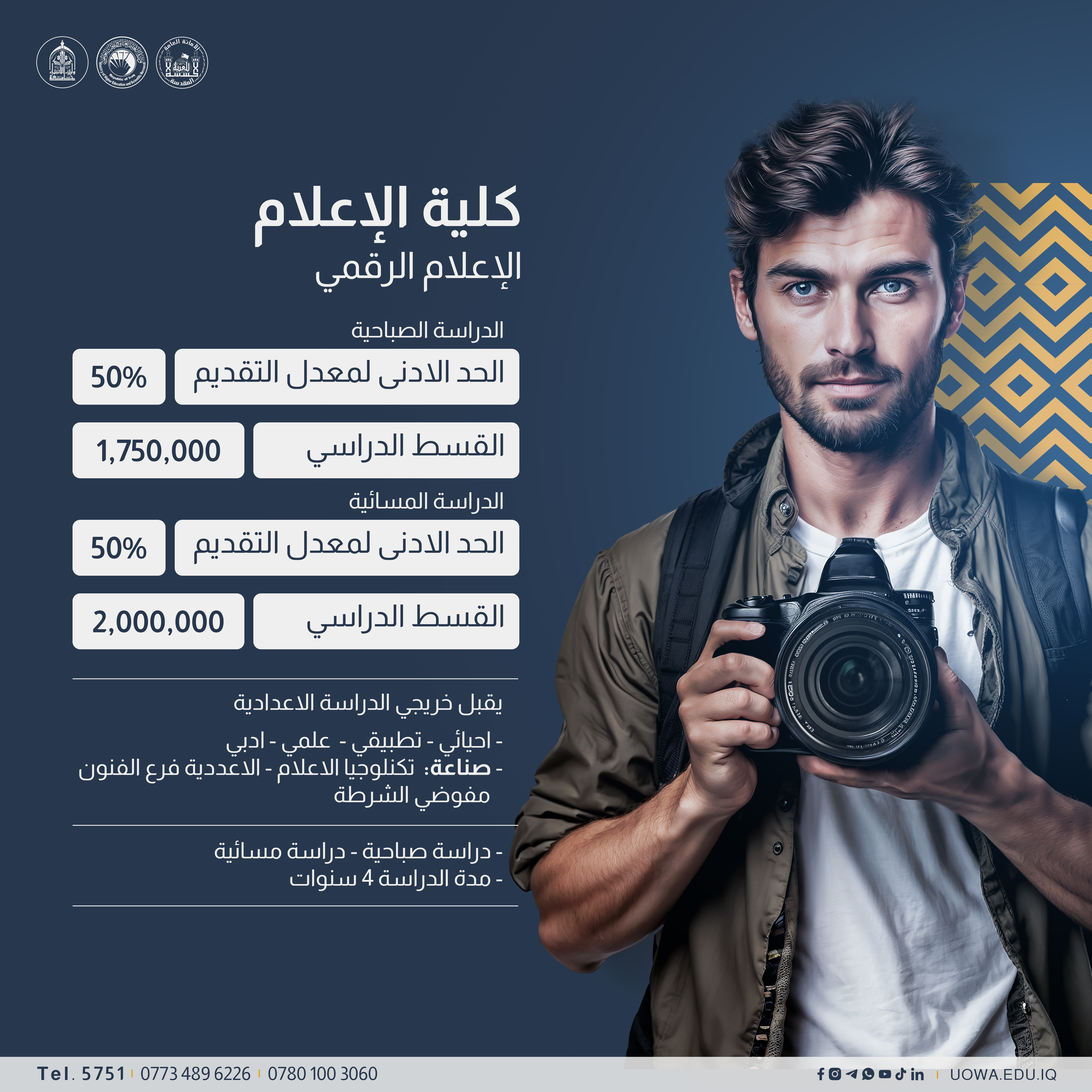 أعلنت دائرة التعليم الجامعي الأهلي عن بدء المرحلة الثالثة من عملية التقديم للجامعات والكليات الأهلية، والتي تشمل ملء الاستمارة الإلكترونية عبر البوابة الرسمية. وأكدت جامعة وارث الأنبياء (عليه السلام) أن فريق التسجيل متاح لاستقبال الطلبة طيلة أيام الأسبوع من الساعة 8 صباحاً حتى 5 مساءً، ويوم الجمعة من الساعة 8 صباحاً حتى 2 ظهراً، لتقديم المساعدة في مراحل التقديم كافة: إنشاء حساب الطالب، ملء البيانات، وتعبئة الاستمارة.