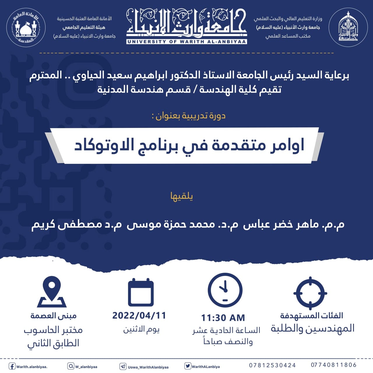 برعاية رئيس جامعة وارث الأنبياء (عليه السلام) الاستاذ الدكتور ابراهيم الحياوي، أقام قسم الهندسة المدنية في الجامعة دورة تدريبية بعنوان "أوامر متقدمة في برنامج الأوتوكاد"، ألقاها كل من