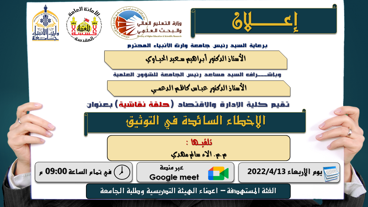 يقيم مركز التعليم المستمر في جامعة وارث الانبياء (عليه السلام) بالتعاون مع كلية الادارة والاقتصاد ندوة علمية بعنوان "الاخطاء السائدة في التوثيق"، تلقيها ... م.م الاء سالم مهدييوم الاربعاء الموافق 2022/4/13 ، في تمام الساعة الـ 9:00 مساءً ، علماً ان الندوة تستهدف الهيئة التدريسية وطلبة كلية الادارة والاقتصاد عبر منصة Google meet