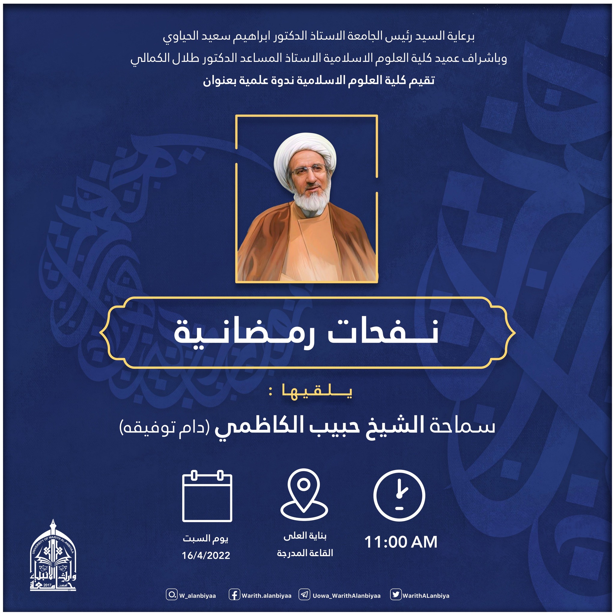 برعاية الاستاذ الدكتور ابراهيم الحياوي وبإشراف عميد كلية العلوم الاسلامية الاستاذ المساعد طلال الكمالي، تقيم الكلية ندوة بعنوان " نفحات رمضانية" يلقيها سماحة الشيخ حبيب الكاظمي، اليوم السبت الموافق 16-4-2022 على القاعة المدرجة في بناية العلا داخل الحرم الجامعي.