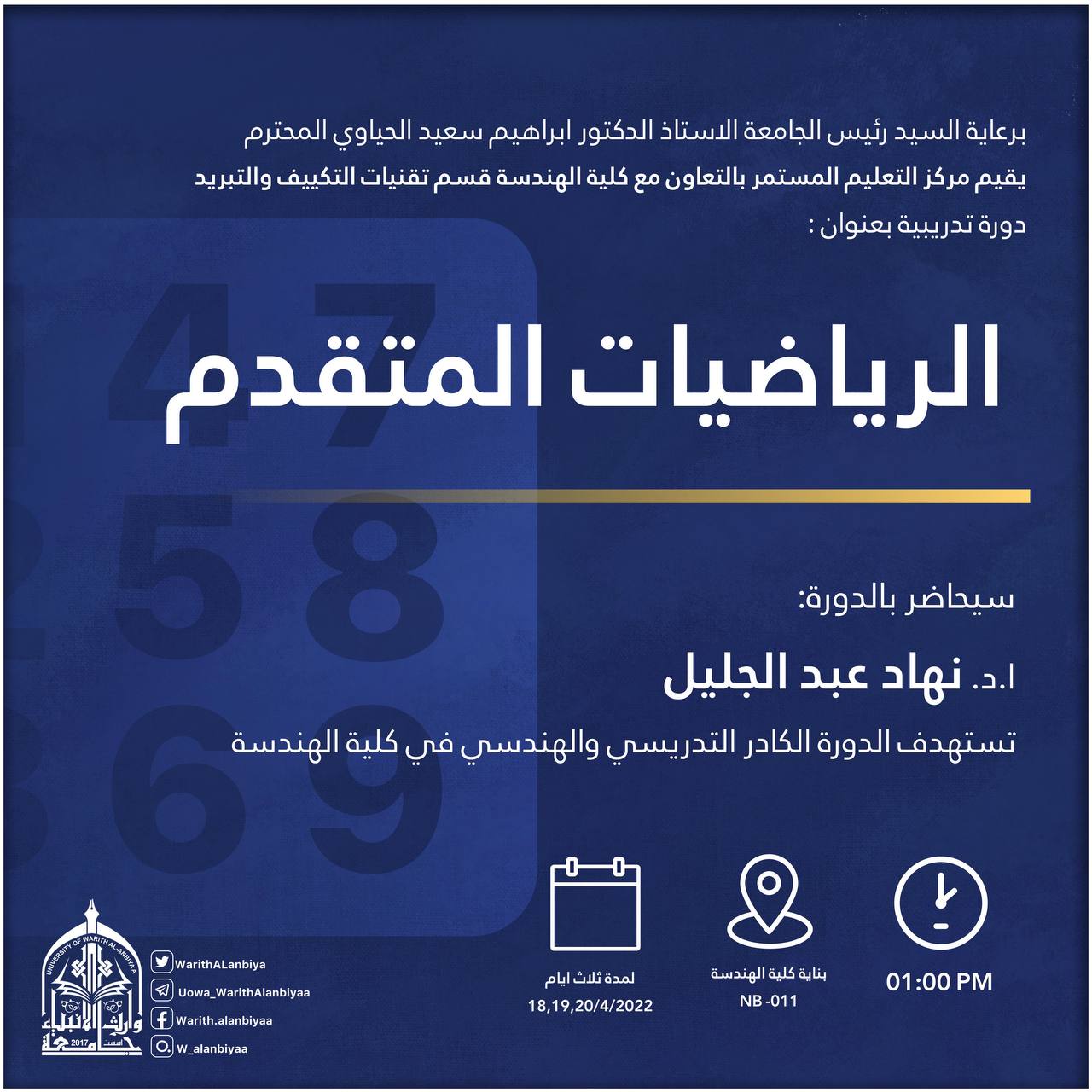برعاية رئيس الجامعة الاستاذ الدكتور ابراهيم الحياوي يقيم مركز التعليم المستمر وبالتعاون مع كلية الهندسة/ قسم تقنيات التكييف والتبريد دورة تدريبية بعنوان " الرياضيات المتقدم"، يحاضر فيها