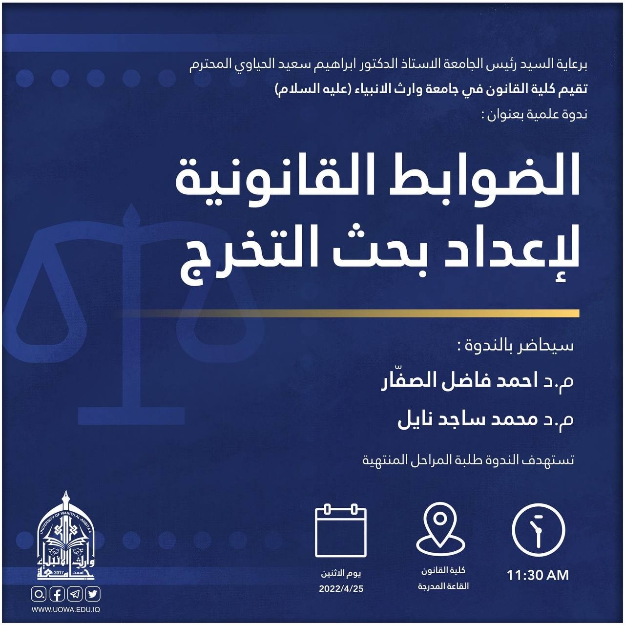 برعاية رئيس الجامعة الاستاذ الدكتور ابراهيم الحياوي تقيم كلية القانون في الجامعة ندوة علمية بعنوان "الضوابط القانونية لإعداد بحث التخرج"