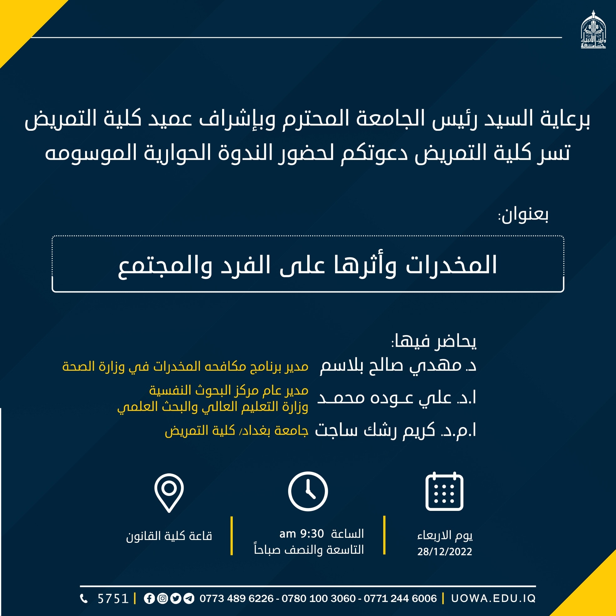تحت رعاية السيد رئيس جامعة وارث الانبياء (عليه السلام) الاستاذ الدكتور ابراهيم الحياويوبأشراف السيد عميد كلية التمريض أ.م.د. مرتضى غانم عداي الجبورييقيم مركز التعليم المستمر في جامعة وارث الانبياء وبالتعاون مع كلية التمريض