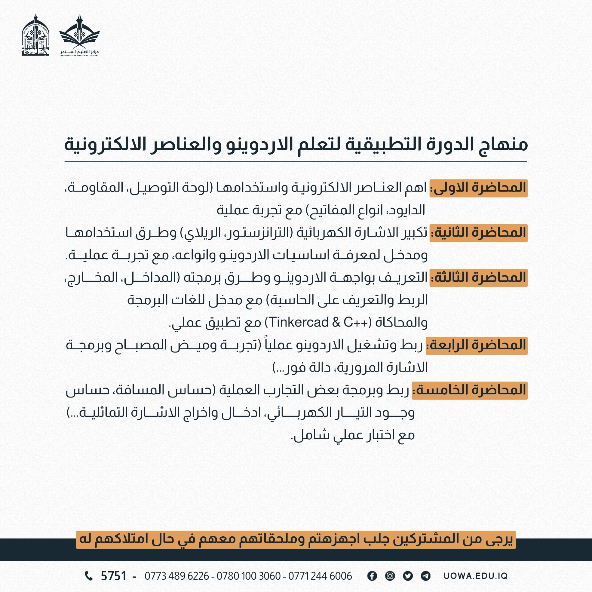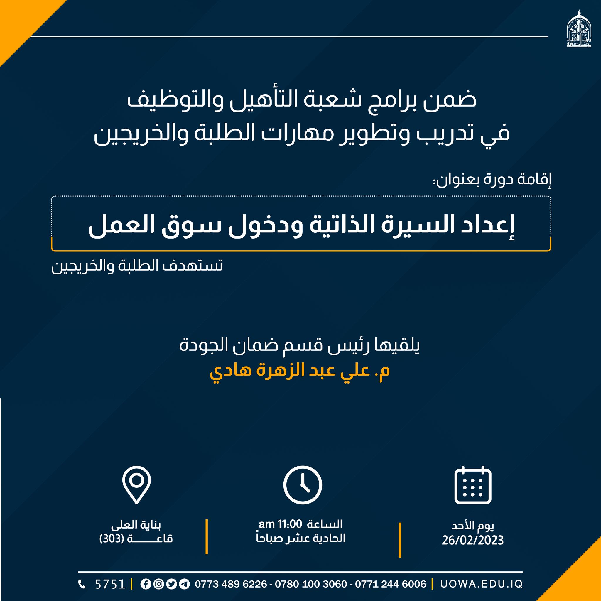 يذكر أن مركز التعليم المستمر قد اعد برنامج مكثف لتزويد طلبة الجامعة وبالاخص طلبة المرحلة الرابعة المقبلين على التخرج بالمهارات اللازمة لزجهم في سوق العمل.