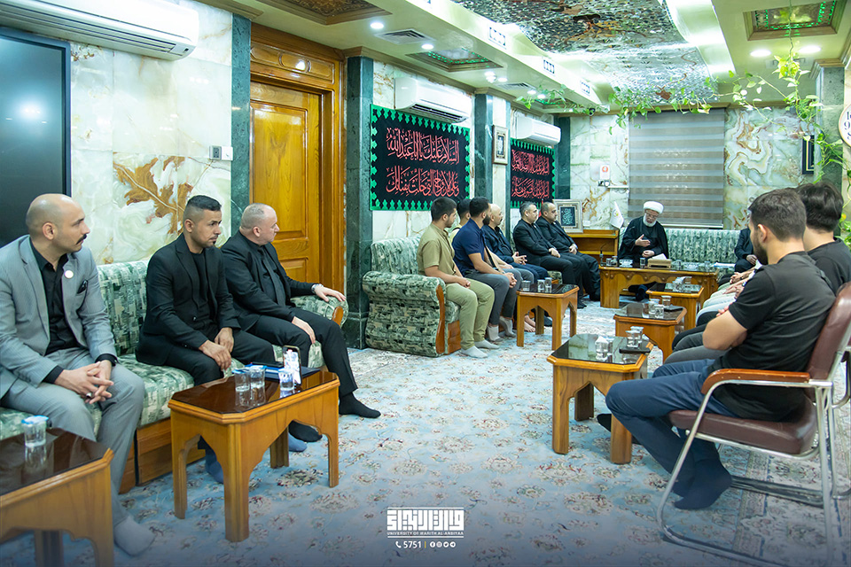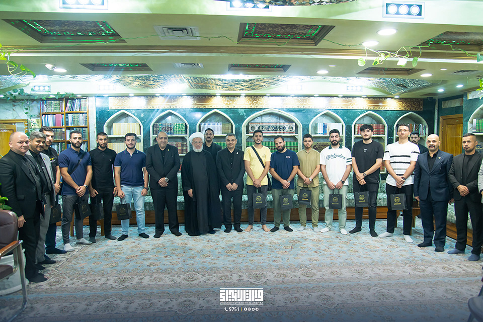 In his office, His Eminence, Sheikh Abdul-Mahdi Al-Karbalai (may his glory last), the legal guardian of the Holy Shrine of Imam Hussein, welcomed Professor Dr. Ibrahim Saeed Al-Hayawi, President of the University of Warith Al-Anbiyaa (PBUH), Professor Dr. Waqid Al-Moussawi, Vice-President of the University for Scientific Affairs, and several Arab guests taking part in the summer training programme.