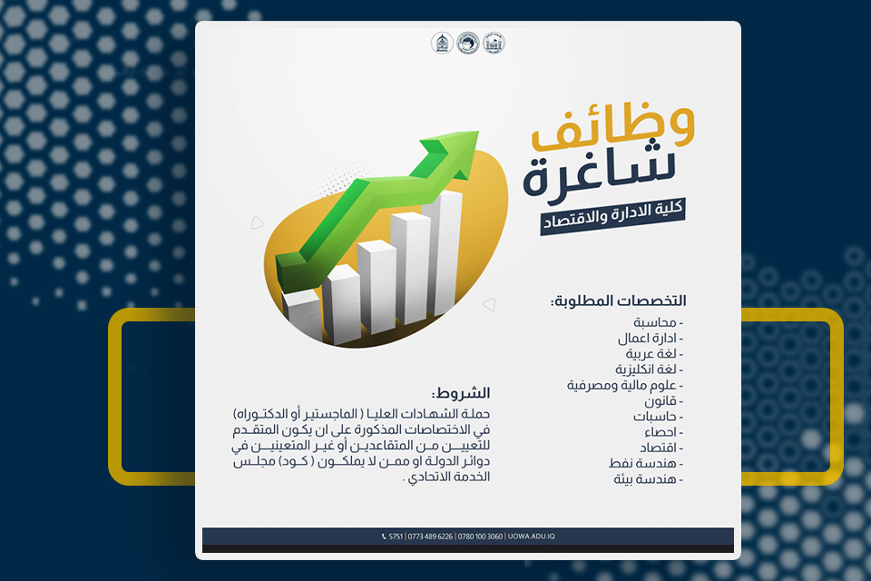 The University of Warith Al-Anbiyaa (PBUH), the College of Administration and Economics, announces its need for job positions in order to fulfil its long-term goals and bolster its teaching staff.