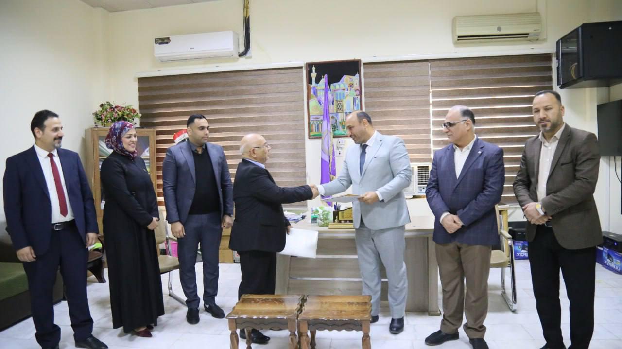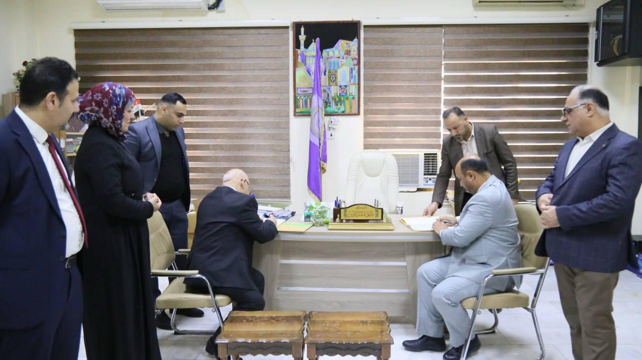 The Dean of the College of Business and Economics, Professor Dr. Hashem Jabar Al-Husseini, received a delegation from the College of Business and Economics at Warith Al-Anbiya University. On Monday morning, an agreement for academic cooperation and partnership between the two colleges was signed. Professor Dr. Hashem Jabar Al-Husseini, Dean of the College of Business and Economics at Karbala University, signed on behalf of his college, while Professor Dr. Awad Al-Khalidi, Dean of the College of Business and Economics at Warith Al-Anbiya University, signed on behalf of his college.